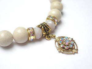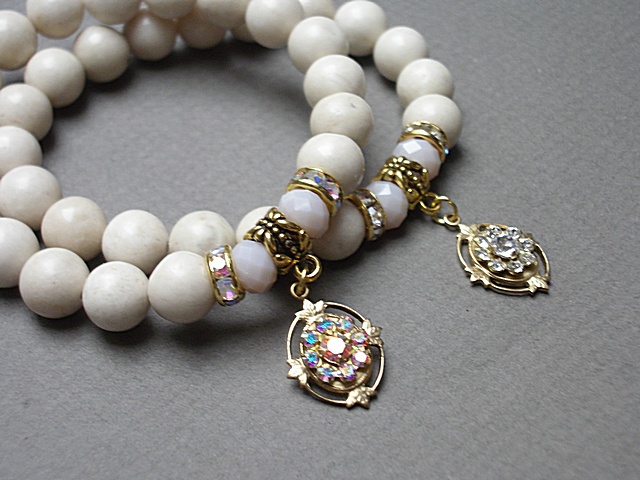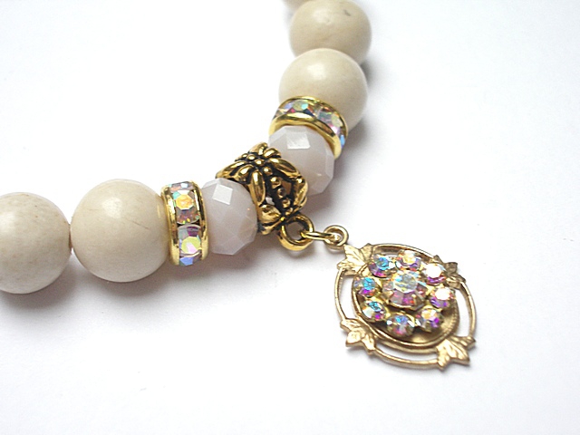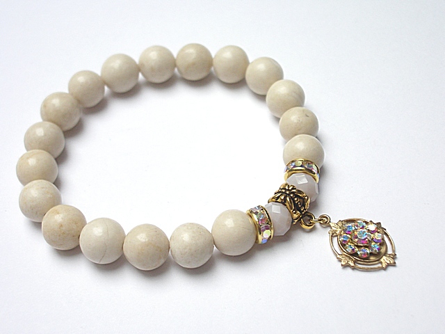 PROJEKTY AUTORSKIE .WŁASNOŚĆ KI-KA. Bransoletka wykonana z naturalnych kamieni - kule marmuru [10mm] kryształków fasetowanych [8mm] ,przekładek z cyrkoniami,zawieszką Swarovski elements [crystal AB] oraz elementów w kolorze złota. Bransoletka na gumce silikonowej. Pasuje na nadgarstek 16-17cm. Biżuteria ozdobnie zapakowana. Możliwość dopasowania bransoletki do nadgarstka - wcześniej prosimy o kontakt