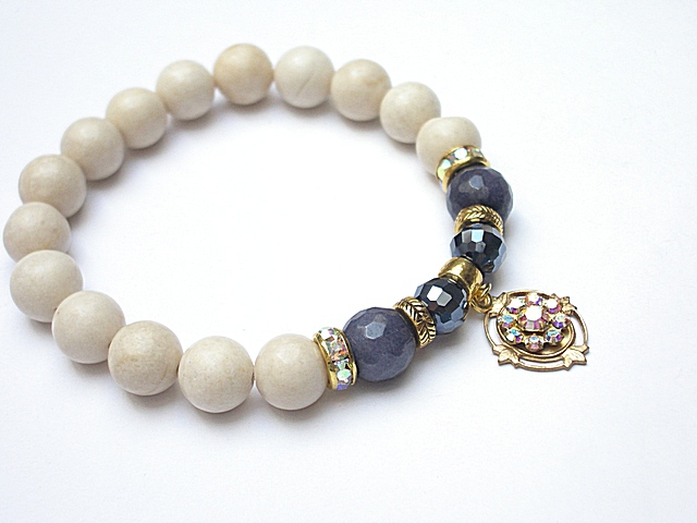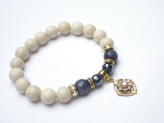 PROJEKTY AUTORSKIE . WŁASNOŚĆ KI-KA. KOPIOWANIE ZABRONIONE. Bransoletka wykonana z naturalnych kamieni - kule marmuru [10mm], jadeity fasetowane [10mm], kryształków fasetowanych [8mm] ,przekładek z cyrkoniami, zawieszki Swarovski elements [crystal AB] oraz elementów w kolorze złota. Bransoletka na gumce silikonowej. Pasuje na nadgarstek 16-17cm. Biżuteria ozdobnie zapakowana. Możliwość dopasowania bransoletki do nadgarstka - wcześniej prosimy o kontakt.