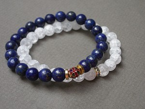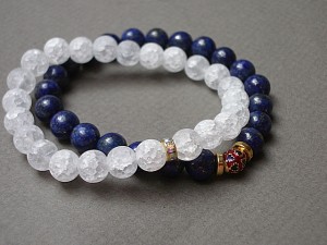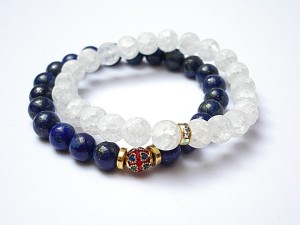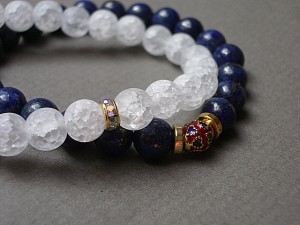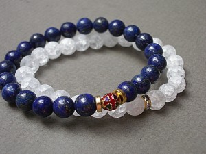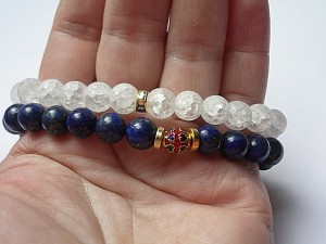 Komplet dwóch bransoletek wykonanych z lapis lazuli [8mm], kwarcu lodowego matowego [8mm] oraz elementów w kolorze złota. Bransoletki pasują na nadgarstek 15 - 16,5cm. Biżuteria ozdobnie zapakowana.