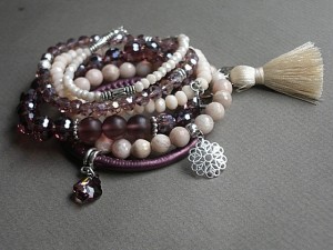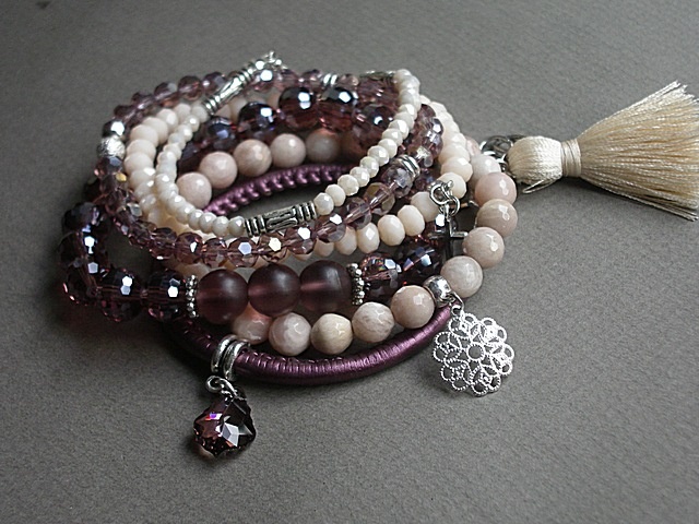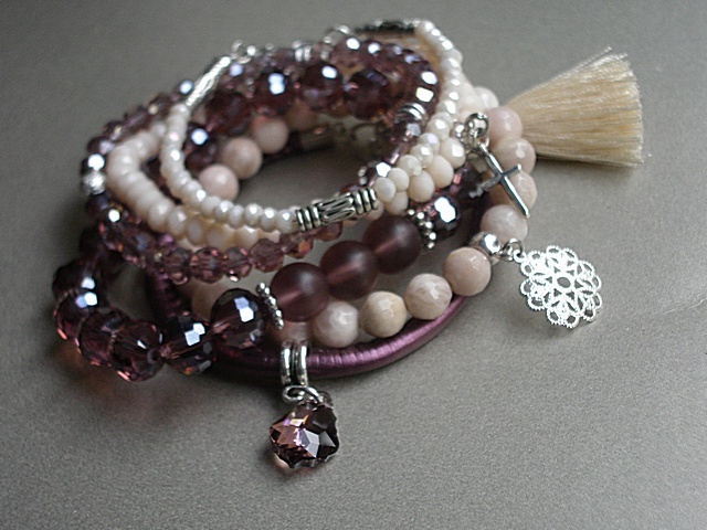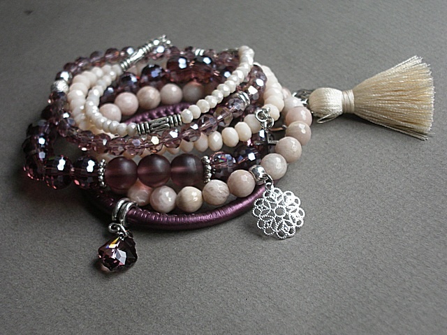 Komplet sześciu bransoletek wykonanych z naturalnych kamieni [kamień słoneczny, 8mm], z rzemienia z ekologicznej skórki, kryształków [szkło bardzo dobrej jakości, satynowego chwostu, kryształka Swarovskiego oraz elementów w kolorze srebra. Pasują na nadgarstek 16cm. Biżuteria ozdobnie zapakowana.