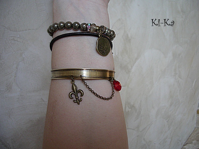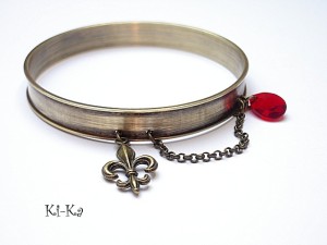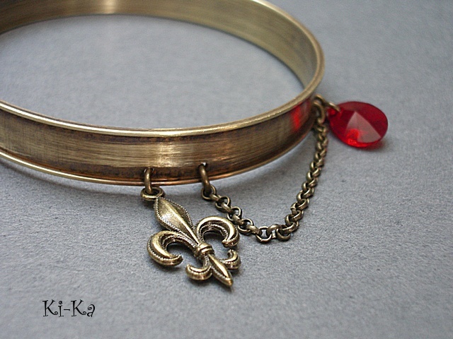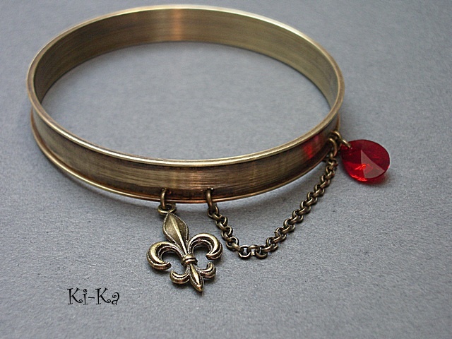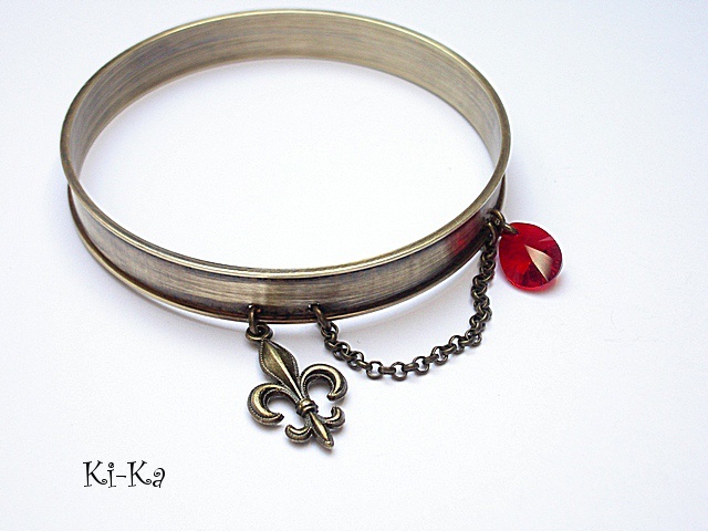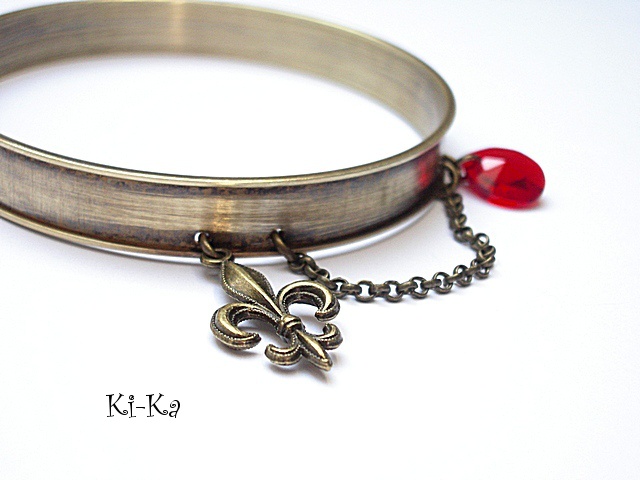 PROJEKT AUTORSKI. Bransoletka z kolekcji "RING" wykonana z obręczy z mosiądzu [szerokość 10mm] przywieszki z krysztalkiem Swarovskiego, oraz elementów w kolorze starego złota. Pasuje na nadgarstek 16-17cm. Biżuteria ozdobnie zapakowana. Bransoletka może stanowić komplet z innymi modelami - przykładowe zdjęcia.
