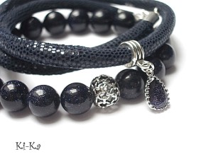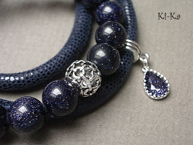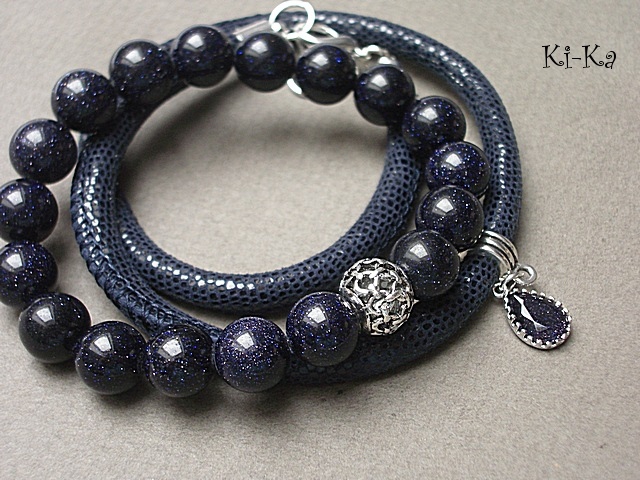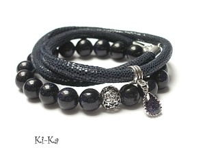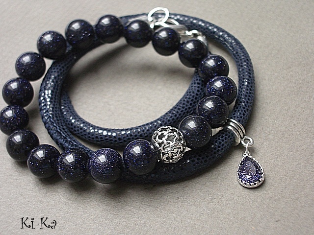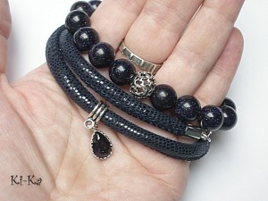 PROJEKT AUTORSKI. WŁASNOŚĆ KI-KA. KOPIOWANIE ZABRONIONE. Komplet dwóch bransoletek wykonany z kuleczek nocy kairu [10mm] , skórzanego rzemienia z mięciutkiej, koziej skórki [6mm] ,zawieszki w okuciu [noc kairu] oraz elementów metalowych w kolorze srebrnym. Bransoletka z kamieni na gumce silikonowej. Pasują na nadgarstek 16-17cm. Biżuteria ozdobnie zapakowana. Możliwość dopasowania bransoletki do nadgarstka - wcześniej prosimy o kontakt.