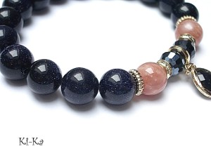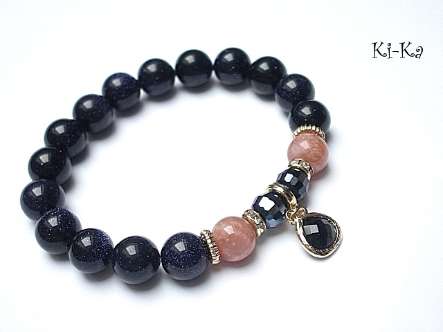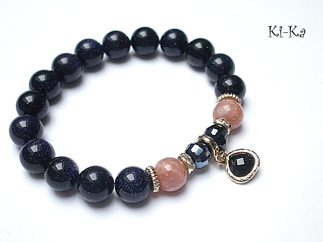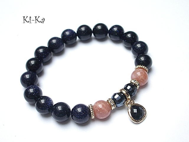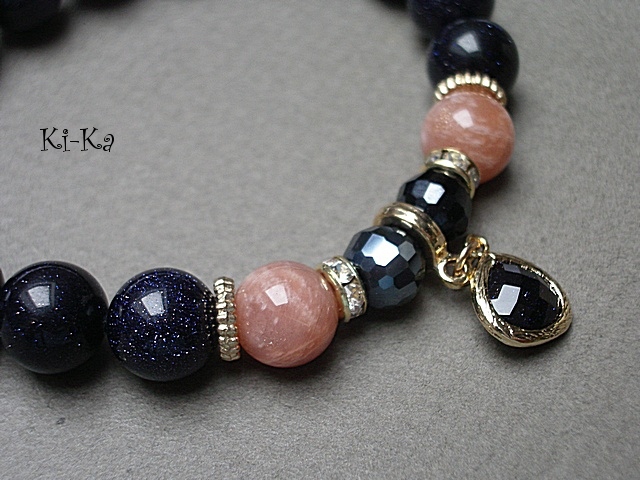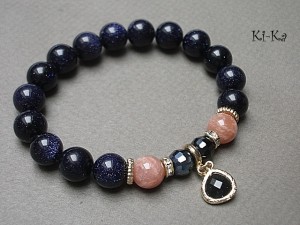 PROJEKT AUTORSKI, WŁASNOŚĆ KI-KA. KOPIOWANIE ZABRONIONE. Bransoletka wykonana z naturalnych kamieni -noc kairu [10mm], kamień słoneczny [10mm], kryształków fasetowanych [8mm], efektownej zawieszki ze szkła w oprawie platerowanej mosiądzem oraz z elementów w kolorze tzw. różowego złota. Bransoletka na gumce silikonowej. Będzie pasowała na nadgarstek 16-17cm. Biżuteria ozdobnie zapakowana