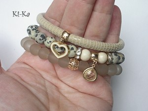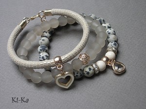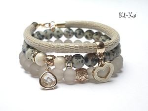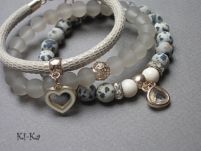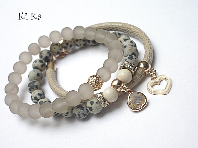 PROJEKT AUTORSKI. Własność KI-Ka. KOPIOWANIE ZABRONIONE. Komplet trzech bransoletek wykonany z kamieni naturalnych -matowe jaspisy [8mm],marmur [8mm] matowe szklane kuleczki [8mm], efektownej zawieszki ze szkła w oprawie rzemienia z naturalnej, miękkiej skóry cielęcej [śr. 6mm] oraz elementów metalowych w kolorze tzw. różowego złota. Pasują na nadgarstek 16-17cm. Bransoletki z kamieni i szkła na gumce silikonowej. Biżuteria ozdobnie zapakowana.