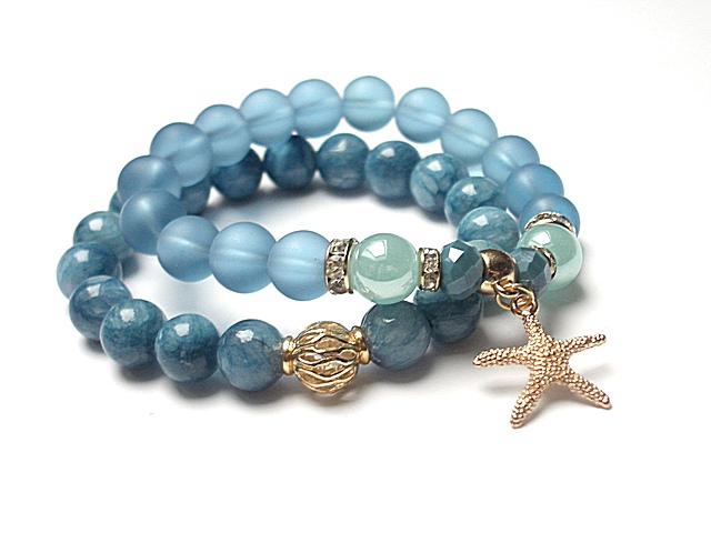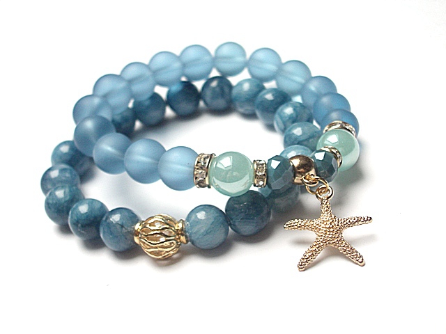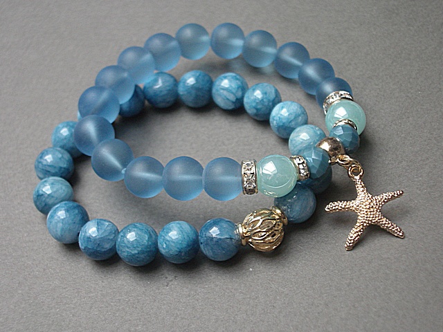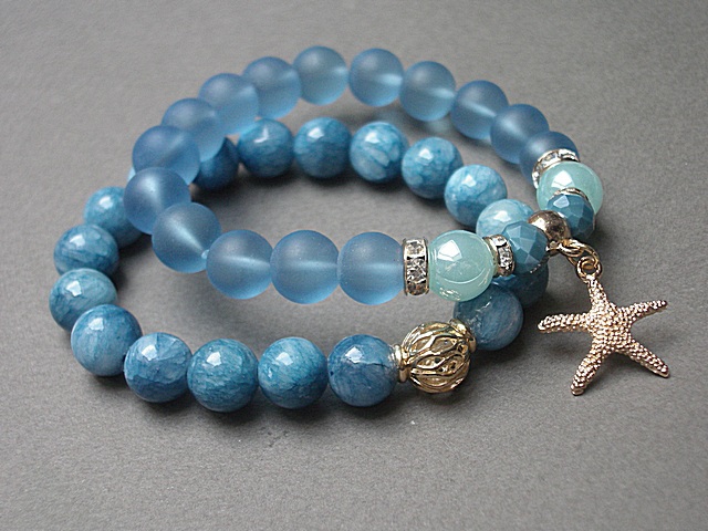 PROJEKT AUTORSKI. Komplet dwóch bransoletek wykonany z naturalnych kamieni - jadeity [10 mm], szklane opalizujące kuleczki [10mm], szklane matowe kuleczki, kryształki [8mm] oraz elementów metalowych w kolorze złotym. Bransoletki gumce silikonowej. Pasują na nadgarstek 16-17cm. Biżuteria ozdobnie zapakowana