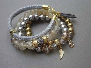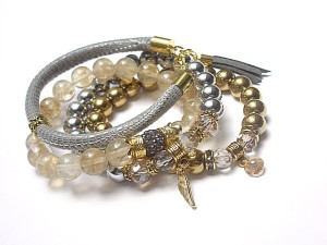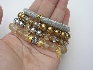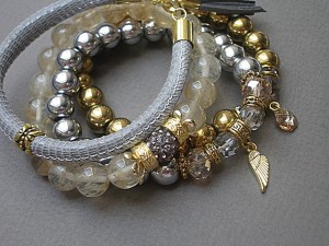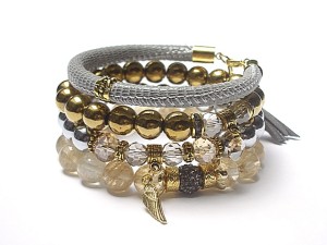 Komplet czterech bransoletek wykonanych z naturalnych kamieni - kwarc kawowy [10mm], hematyt [10mm], kryształków fasetowanych [8mm i 10mm], kuleczki shamballa wysadzanej kryształkami Swarovskiego [10mm], zawieszki z kryształka Swarovskiwego [8mm], rzemienia z naturalnej skórki koziej [śr. 6mm] oraz elementów metalowych w złotym kolorze. Bransoletki pasują na nadgarstek 16-17cm. Biżuteria ozdobnie zapakowana.