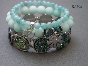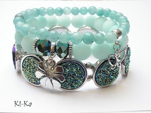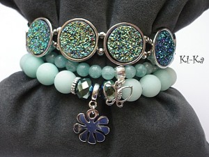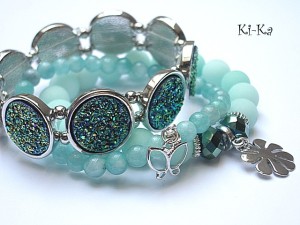 Komplet trzech bransoletek wykonanych z naturalnych kamieni [jadeity matowe 10mm, jadeity gloss 8mm], kryształków [8 x 10mm] ,imitacji druz z akrylu oraz elementów metalowych w srebrnym kolorze Bransoletki pasują na nadgarstek 15,5 - 16,5cm. Biżuteria ozdobnie zapakowana.