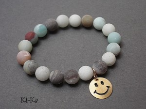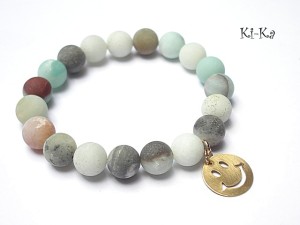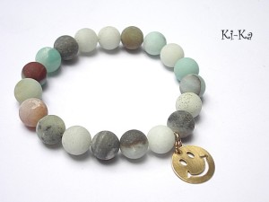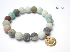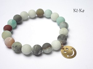 Bransoletka wykonana z naturalnych kamieni- amazonity matowe [10mm] , oraz przywieszki z mosiądzu. Bransoletka na gumce silikonowej. Pasuje na nadgarstek 15,5-16,5cm. Biżuteria ozdobnie zapakowana. Możliwość dopasowania bransoletki do nadgarstka - wcześniej prosimy o kontakt.