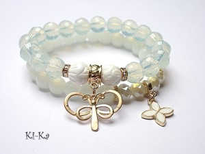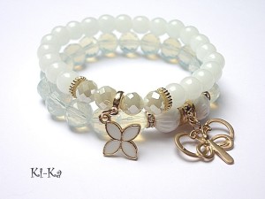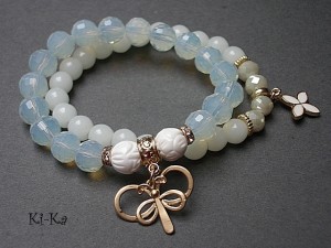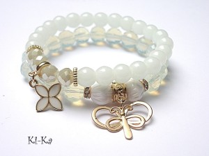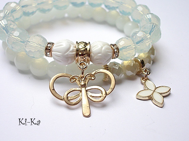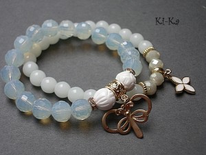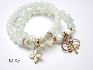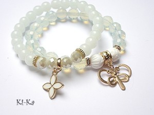 Komplet dwóch bransoletek wykonanych z naturalnych minerałów - jadeity w kolorze jasno - miętowym [8mm], rzeźbionego koral [10mm], kryształków [10mm i 6 x 8mm], przekładek wysadzanych kryształkami oraz elementów w kolorze tzw. różowego złota. Bransoletki na gumce silikonowej. Pasują na nadgarstek 15,5-17cm. Biżuteria ozdobnie zapakowana.