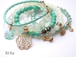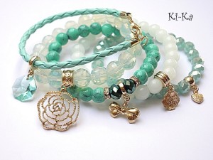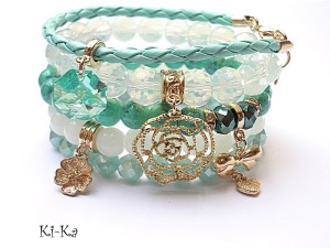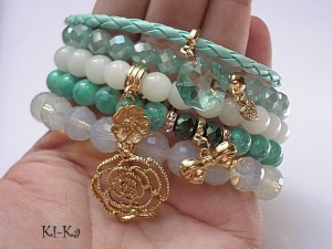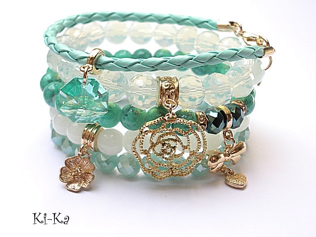 PROJEKT AUTORSKI. .Komplet pięciu bransoletek wykonanych z naturalnych kamieni: jadeity [8mm], kuleczek szklanych [8mm],kryształków, rzemienia z ekologicznej skóry, przywieszki z kryształkiem Swarovskiegooraz elementów metalowych w kolorze jasnego złota. Bransoletki pasują na nadgarstek 15,5 - 16,5cm. Biżuteria ozdobnie zapakowana