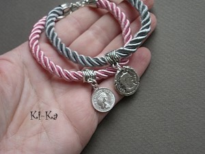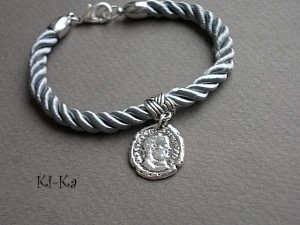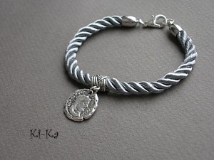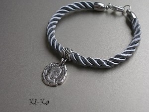 Bransoletka wykonana z elementów metalowych oraz skręcanego sznura w kolorze szarym [śr.6mm] .Całkowita długość bransoletki 20cm.Pasuje na nadgarstek 16cm. Zdjęcie pierwsze przedstawia przykładową kompozycję, cena dotyczy bransoletki z szarego sznura. Biżuteria ozdobnie zapakowana
