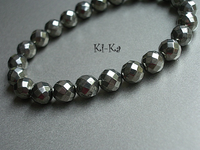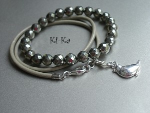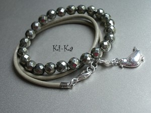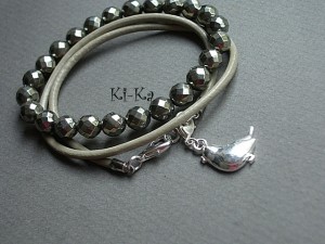 Komplet dwóch bransoletek wykonanych z kamieni naturalnych - fasetowane piryty [8mm], rzemienia z naturalnej skóry oraz elementów metalowych w kolorze srebrnym . Pasują na nadgarstek 15,5 - 16,5cm. Biżuteria ozdobnie zapakowana. Zdjęcie pierwsze i ostatnie przedstawia przykładowy set - cena dotyczy bransoletki z hematytów i rzemienia..