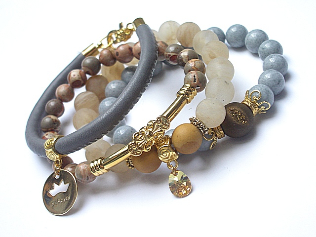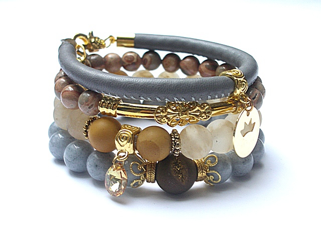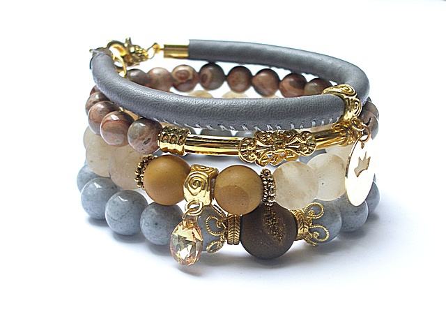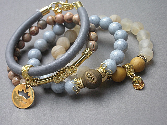 PROJEKT AUTORSKI. WŁASNOŚĆ KI-KA. KOPIOWANIE ZABRONIONE. Komplet czterech bransoletek wykonanych z naturalnych kamieni: jadeity [10mm], jaspisy [8mm], jaspisy mokait matowe [10mm], druza agatu z efektownym pęknięciem pokryta tytanem [12mm], matowe kuleczki kwarców kawowych [10mm], zawieszki z mosiądzu platerowanej złotem, zawieszki z kryształka Swarovskiego, rzemienia z naturalnej skórki [śr.6mm] oraz elementów metalowych w kolorze złotym. Bransoletki pasują na nadgarstek 15 - 16,5cm. Biżuteria ozdobnie zapakowana