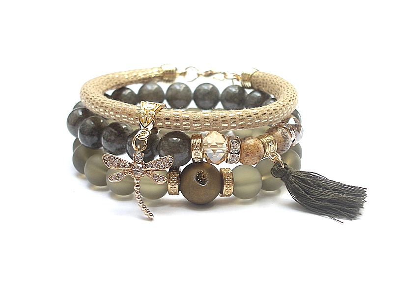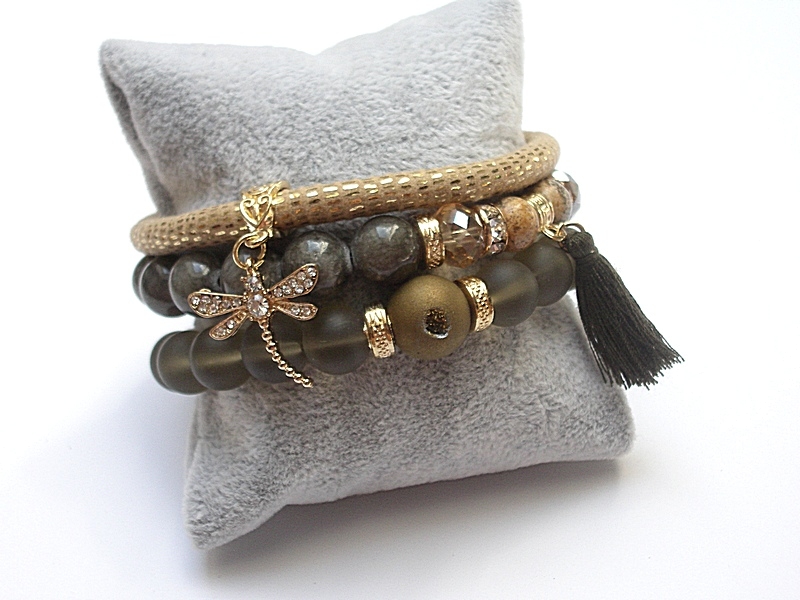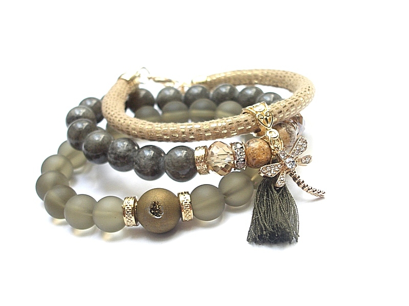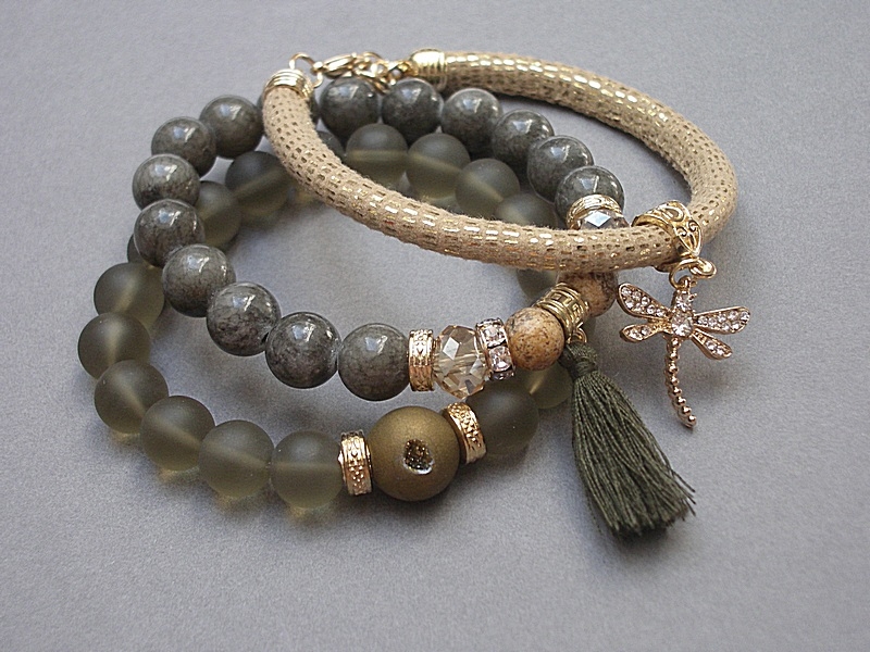 Komplet trzech bransoletek wykonanych z naturalnych kamieni: jadeity [10mm], jaspisy [8mm], szklane matowe kuleczki [10mm], kula agatu z druzą [12mm], kryształki [10mm], zawieszki z cyrkoniami, rzemienia z eco skórki [6mm], chwosta oraz elementów metalowych w kolorze złotym. Bransoletki pasują na nadgarstek 16 - 17cm. Biżuteria ozdobnie zapakowana