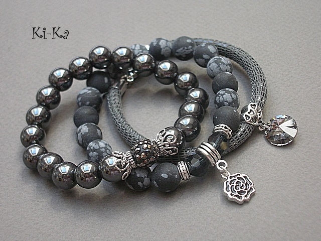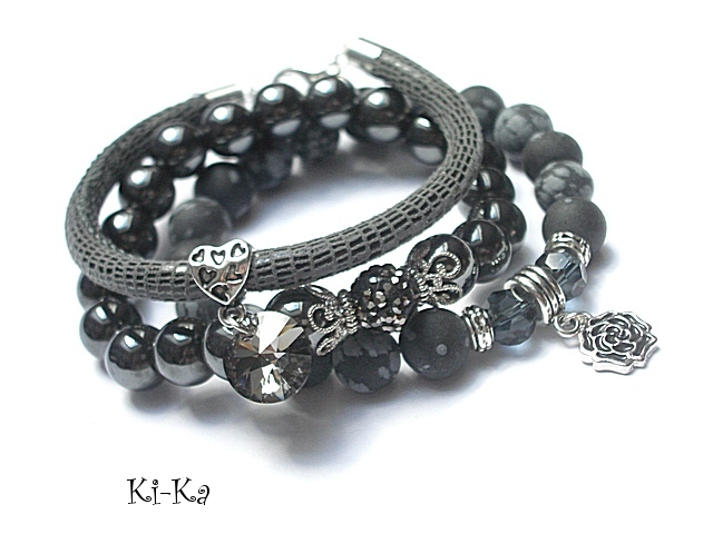 PROJEKTY AUTORSKIE. WŁASNOŚĆ KI-KA. KOPIOWANIE ZABRONIONE. Komplet trzech bransoletek wykonany z naturalnych kamieni - obsydian matowy [10 mm], hematyty [10mm], kryształków fasetowanych [8mm], rzemienia z naturalnej, cielęcej skórki [śr. 6mm], przekładki shamballa wysadzanej kryształkami Swarovskiego, przywieszki z kryształkiem Swarovskiego oraz elementów metalowych w kolorze srebra. Bransoletki z kamieni na gumce silikonowej. Pasują na nadgarstek 16-17cm. Biżuteria ozdobnie zapakowana