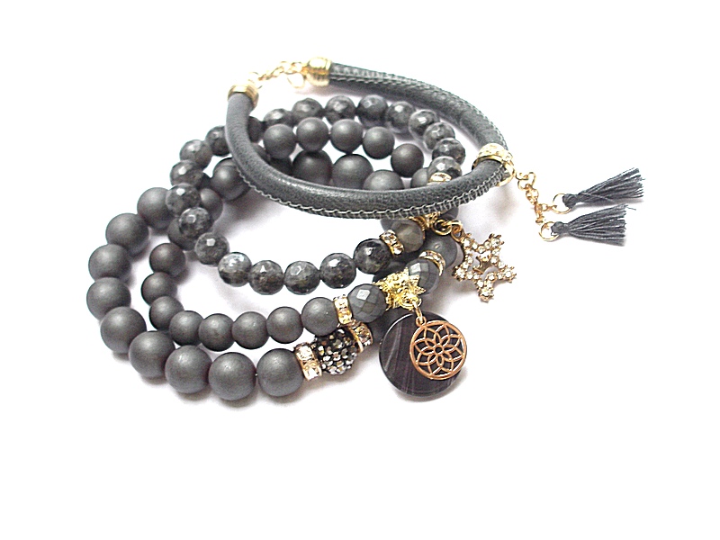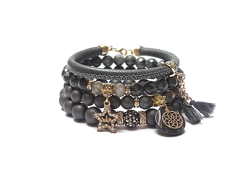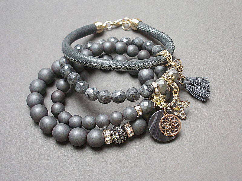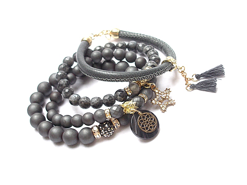 Komplet czterech bransoletek wykonanych z naturalnych kamieni: hematyt matowy [8 i 10mm], hematyt matowy fasetowany [8mm], larvikit fasetowany [8mm], kryształków fasetowanych [8mm], rzemienia z naturalnej skórki, zawieszki wysadzanej cyrkoniami, przekładki shamballa wysadzanej kryształkami, zawieszki z żywicy, chwostów oraz elementów metalowych w kolorze złota. Bransoletki pasują na nadgarstek 16 - 17cm. Biżuteria ozdobnie zapakowana