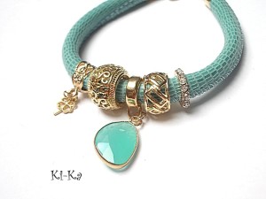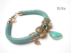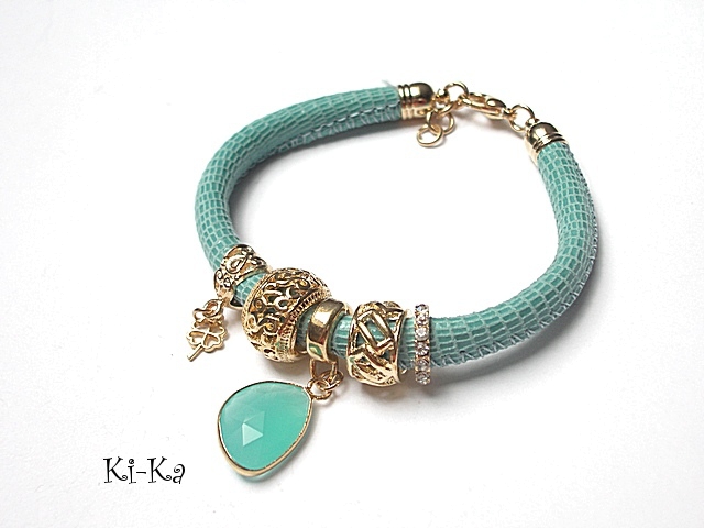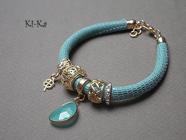 PROJEKT AUTORSKI. WŁASNOŚĆ KI-KA. KOPIOWANIE ZABRONIONE. Bransoletka wykonana z rzemienia z naturalnej, mięciutkiej skórki cielęcej [5mm] ,zawieszki ze szkła oraz elementów metalowych w kolorze różowego złota. Bransoletka pasuje na nadgarstek 16-17cm. Biżuteria ozdobnie zapakowana
