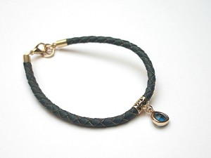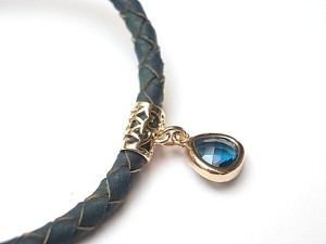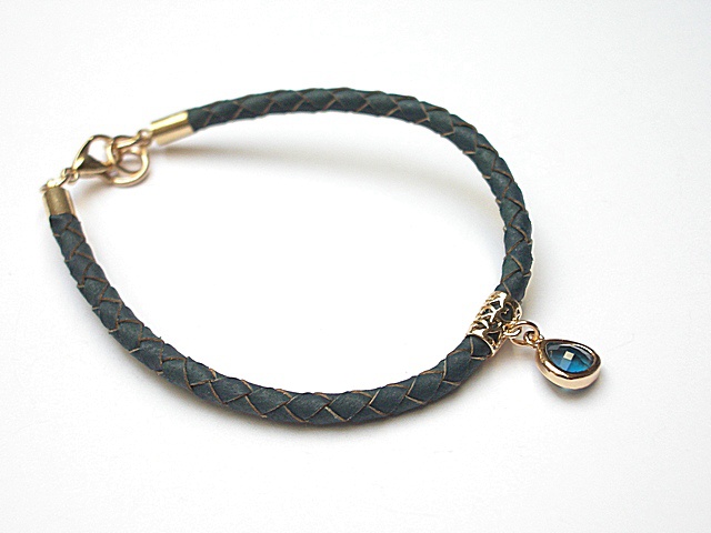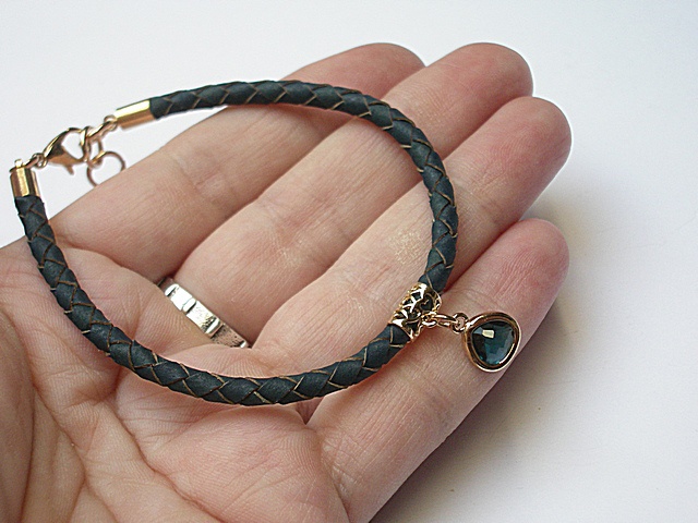 Bransoletka wykonana z rzemienia z naturalnej skóry w kolorze denim , efektownej zawieszki oraz elementów w kolorze tzw. różowego złota. .Całkowita długość bransoletki 19cm. Biżuteria ozdobnie zapakowana