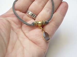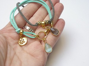 Bransoletka wykonana z rzemienia z zamszu ekologicznego , efektownej zawieszki z uleksytem oraz elementów w kolorze złotym. .Całkowita długość bransoletki 19cm. Możliwość dopasowania do nadgarstka - wcześniej prosimy o kontakt. Biżuteria ozdobnie zapakowana. Bransoletka może stanowić komplet z innymi bransoletkami - przykładowe zdjęcia