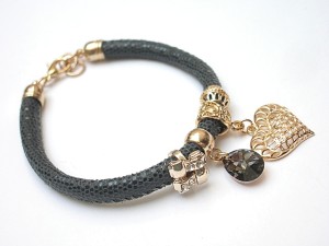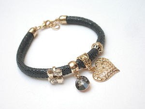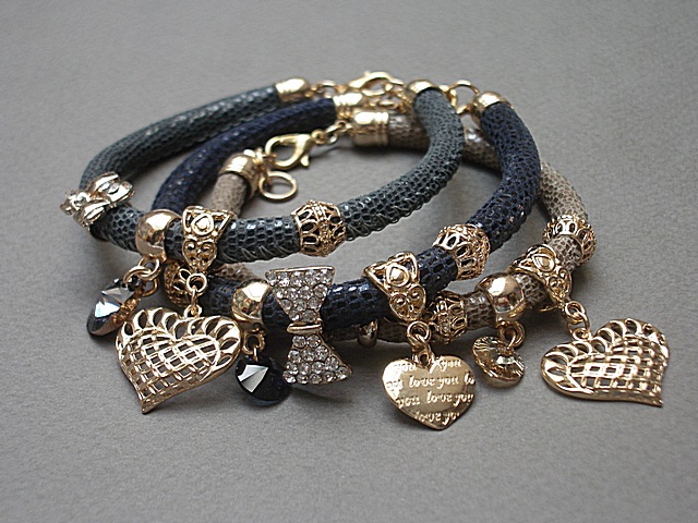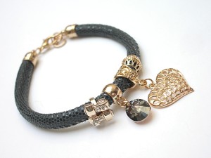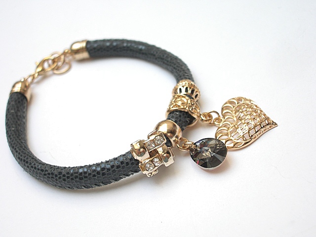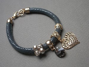 PROJEKT AUTORSKI. WŁASNOŚĆ KI-KA. KOPIOWANIE ZABRONIONE. Bransoletka wykonana z rzemienia z naturalnej, mięciutkiej skórki cielęcej o wzorze wężowym [6mm],zawieszki kryształka Swarovskiego, przekładki wysadzanej cyrkoniami oraz elementów metalowych w kolorze tzw. różowego złota. Bransoletka pasuje na nadgarstek 16-17cm. Biżuteria ozdobnie zapakowana