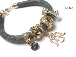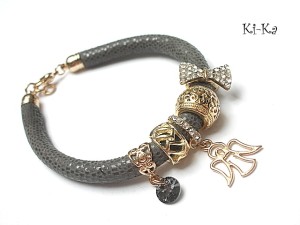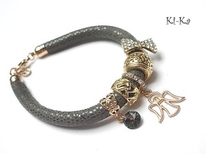 PROJEKT AUTORSKI. WŁASNOŚĆ KI-KA. KOPIOWANIE ZABRONIONE. Bransoletka wykonana z rzemienia z naturalnej, mięciutkiej, skórki cielęcej [7-8mm], zawieszki z kryształka Swarovskiego, przekładek wysadzanych cyrkoniami oraz elementów metalowych w kolorze różowego złota. Bransoletka pasuje na nadgarstek 16-17cm. Biżuteria ozdobnie zapakowana