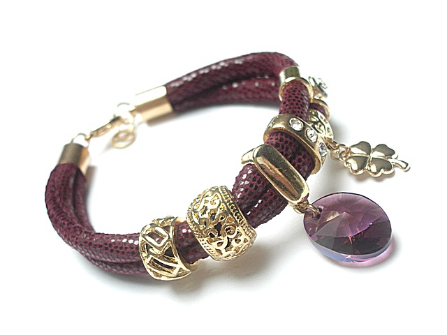 PROJEKT AUTORSKI. WŁASNOŚĆ KI-KA. KOPIOWANIE ZABRONIONE. Bransoletka wykonana z rzemienia z naturalnej, mięciutkiej skórki cielęcej o wzorze wężowym [6mm], zawieszki z kryształka Swarovskiego oraz elementów metalowych w kolorze tzw różowego złota. Bransoletka pasuje na nadgarstek 16-17cm. Biżuteria ozdobnie zapakowana