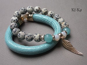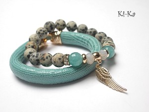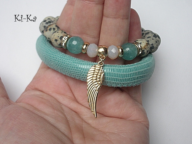 PROJEKT AUTORSKI. WŁASNOŚĆ KI-KA. KOPIOWANIE ZABRONIONE. Komplet dwóch bransoletek wykonanych z rzemienia z naturalnej, grubej skórki cielęcej [10mm], kuleczkami jaspisów matowych [10mm], jadeitami fasetowanymi [10mm], kryształków fasetowanych [6 x 8 mm] oraz elementów metalowych w kolorze złota. Bransoletki pasują na nadgarstek 16-17cm. Biżuteria ozdobnie zapakowana