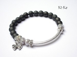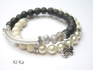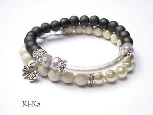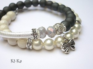 Komplet dwóch bransoletek wykonany z kamieni naturalnych - hematyt matowy [8mm], marmuru [8mm], pereł Majorka [8mm], kryształków [6 x 8mm], przekładek wysadzanych kryształkami oraz elementów w kolorze srebrnym.. Bransoletki pasują na nadgarstek 15,5-16,5cm. Biżuteria ozdobnie zapakowana