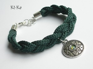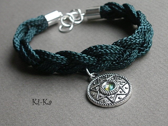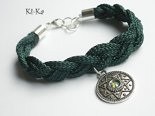 Bransoletka wykonana z elementów metalowych w kolorze srebra, kryształka Swarovskiego oraz sznurków zaplecionych w warkocz . Będzie pasowała na nadgarstek 15,5 -16,5cm. Biżuteria ozdobnie zapakowana. Zdjęcie pierwsze przedstawia przykładowy set, cena dotyczy bransoletki ze sznurka.