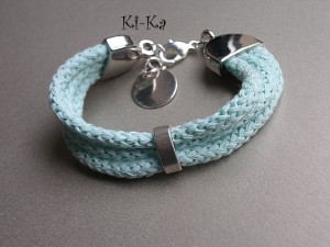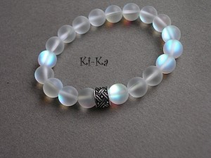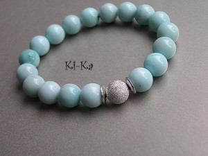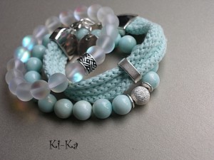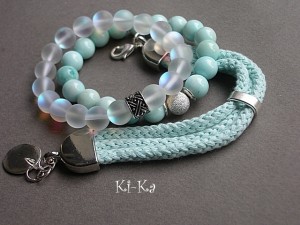 Komplet trzech bransoletek wykonany z kuleczek szronionego kwarcu z efektem AB [10mm], kuleczek amazonitów [10mm], , bawełnianego sznura w błękitnym kolorze oraz z elementów w kolorze srebra . Bransoletki z kamienia na gumce silikonowej. Bransoletki będą pasowały na nadgarstek 15-16cm. Biżuteria ozdobnie zapakowana