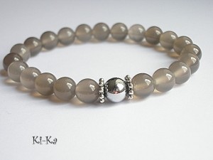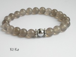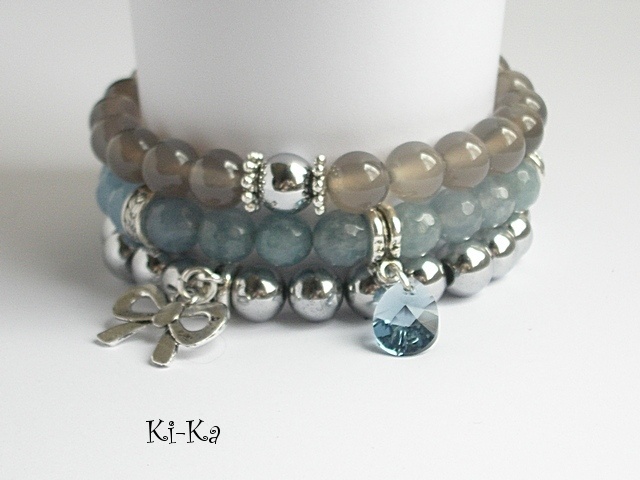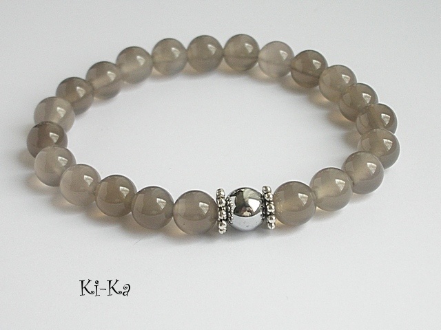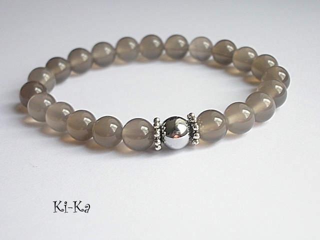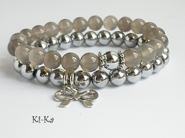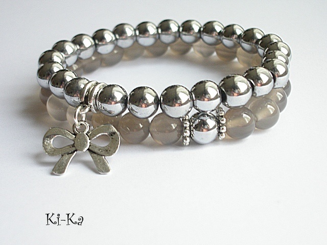 Bransoletka wykonana z naturalnych minerałów - kuleczki agatów [8mm] ,kuleczki srebrnego hematytu [8mm] oraz elementów w kolorze srebra. Bransoletka na gumce silikonowej. Pasuje na nadgarstek 15-16cm. Biżuteria ozdobnie zapakowana. Bransoletka może stanowić komplet z innymi bransoletkami -przykładowe zdjęcia.