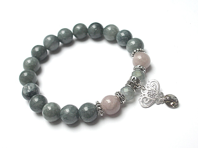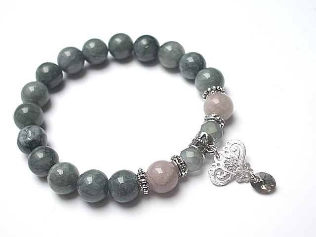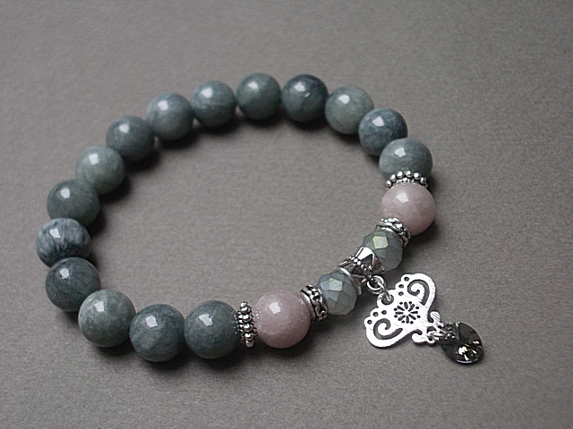 Bransoletka wykonana z kuleczek jadeitów [10mm], kryształków [8mm], zawieszki z kryształka Swarovskiego oraz elementów metalowych w kolorze srebrnym. Bransoletka na gumce silikonowej. Pasuje na nadgarstek 16-17cm. Biżuteria ozdobnie zapakowana. Możliwość dopasowania bransoletki do nadgarstka - wcześniej prosimy o kontakt. Projekty autorskie, kopiowanie zabronione, prace datowane
