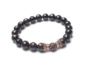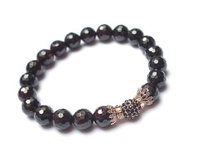Bransoletka wykonana z naturalnych, szlachetnych minerałów - fasetowane granaty [10mm], ekskluzywnej przekładki wysadzanej cyrkoniami oraz elementów w kolorze tzw. różowego złota. Bransoletka na gumce silikonowej. Pasuje na nadgarstek 16-17cm. Biżuteria ozdobnie zapakowana.