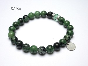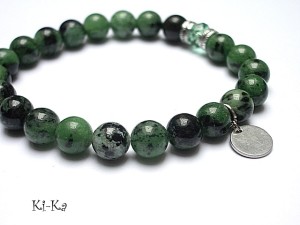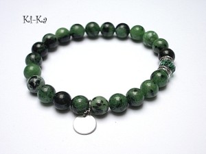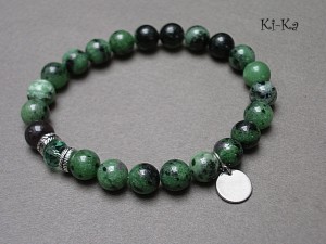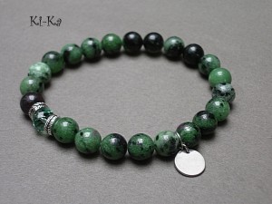 Bransoletka wykonana z naturalnych, minerałów - zoisyt z rubinem [8mm; minerał rzadko występujący w przyrodzie] , kryształka Swarovskiego oraz elementów w kolorze srebra. Bransoletka na gumce silikonowej. Pasuje na nadgarstek 15-16,5cm. Biżuteria ozdobnie zapakowana.