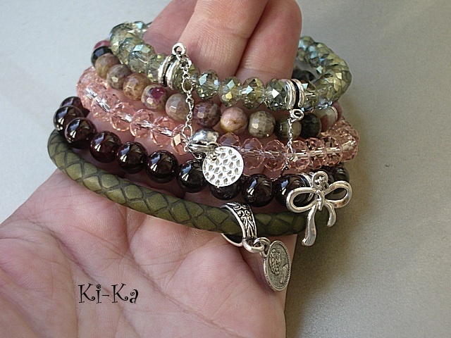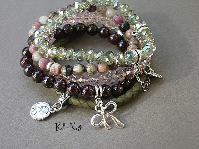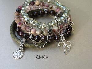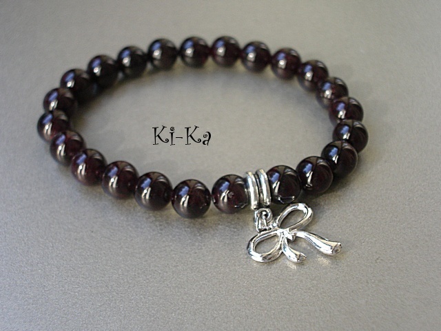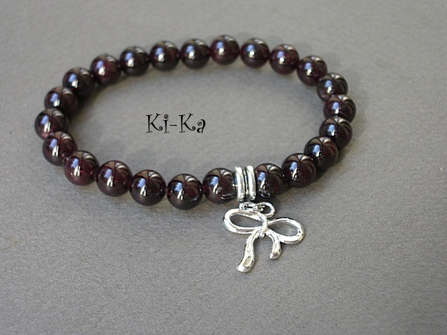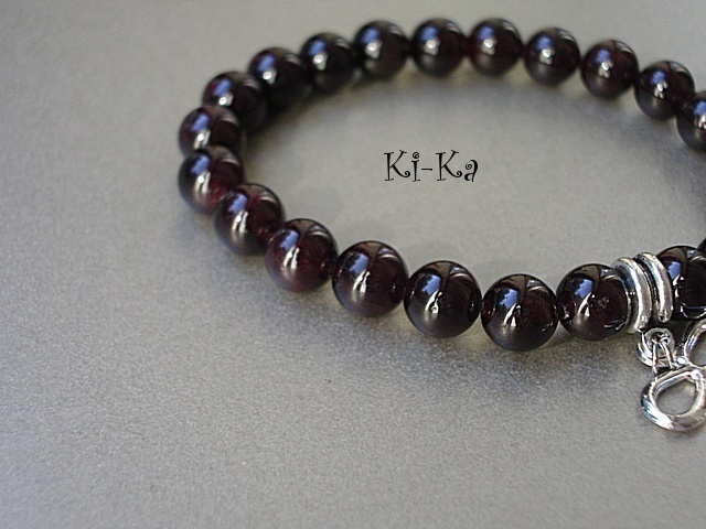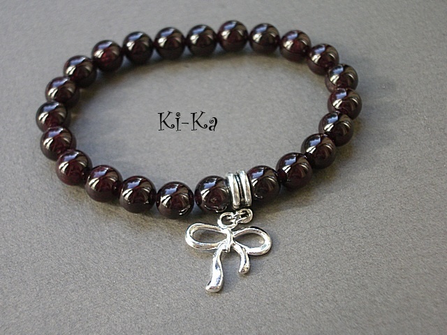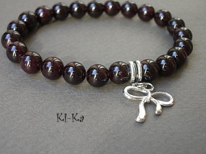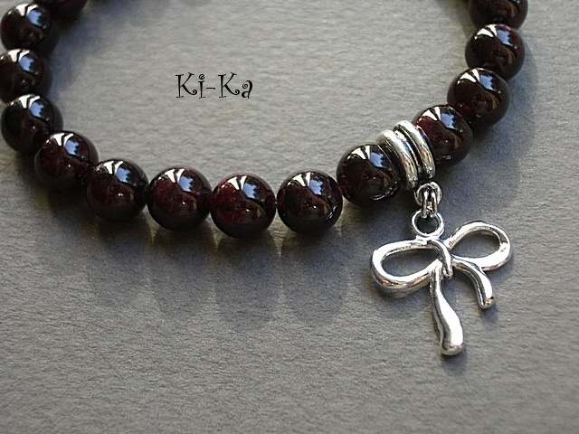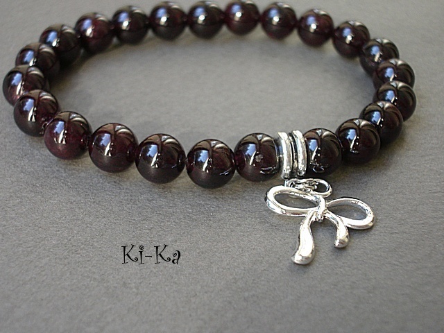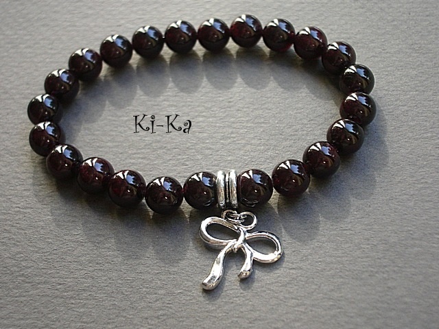 Bransoletka wykonana z naturalnych minerałów [granaty 8mm] oraz elementy w kolorze srebra. Pasuje na nadgarstek 15,5 - 16,5cm. Bransoletka na gumce silikonowej. Biżuteria ozdobnie zapakowana. Bransoletka może stanowić komplet z innymi - przykładowe zdjęcia.