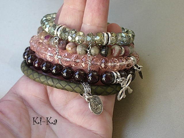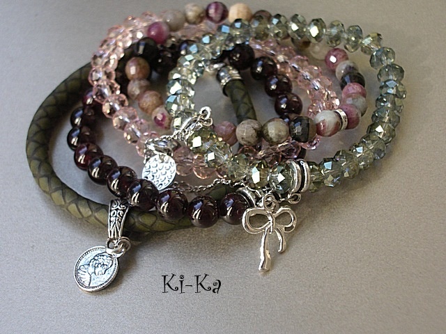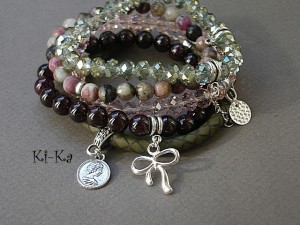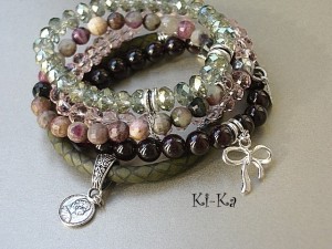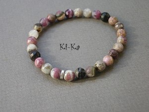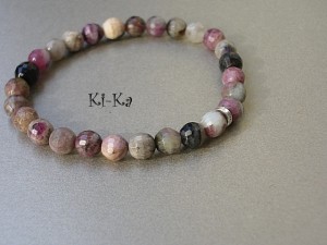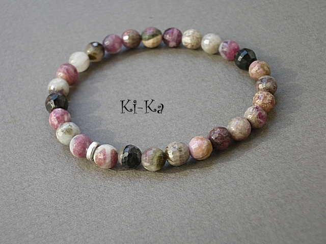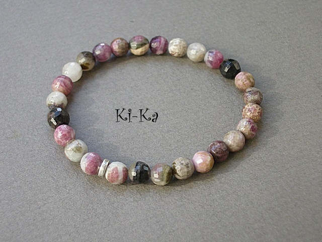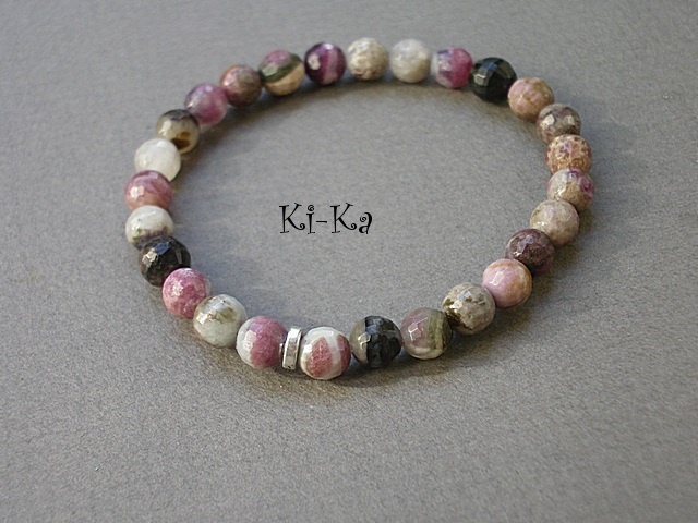 Bransoletka wykonana z naturalnych minerałów [fasetowane turmaliny, rzadko występujące w przyrodzie; 6mm] oraz przekładka w kolorze srebra. Pasuje na nadgarstek 15,5 - 16,5cm. Bransoletka na gumce silikonowej. Biżuteria ozdobnie zapakowana.