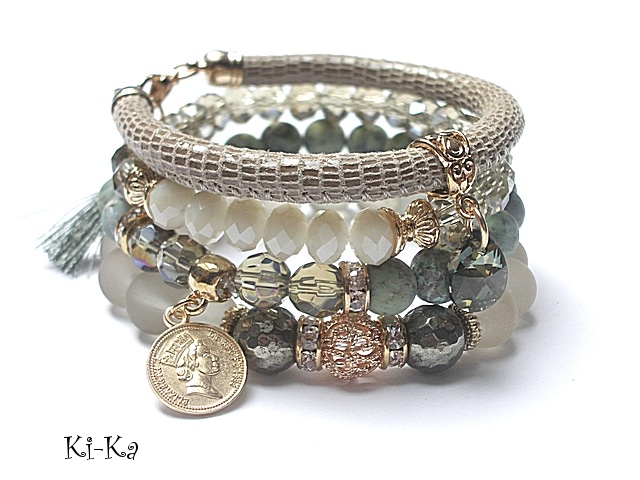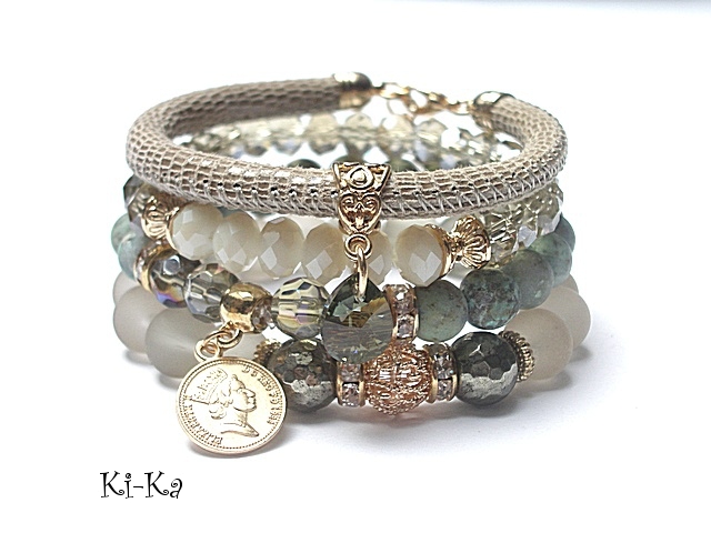 PROJEKT AUTORSKI. WŁASNOŚĆ KI-KA. KOPIOWANIE ZABRONIONE. Komplet czterech bransoletek wykonany z naturalnych kamieni - turkus afrykański matowy [8mm], piryty fasetowane [10mm], szklane, matowe kuleczki [10mm], kryształki fasetowane [6 x 8mm oraz 8mm], skórzanego rzemienia z naturalnej skórki, zawieszki z kryształkiem Swarovskiego, satynowego chwostu oraz elementów metalowych w kolorze tzw. różowego złota. Bransoletki z kamieni na gumce silikonowej. Pasują na nadgarstek 16-17cm. Biżuteria ozdobnie zapakowana. Możliwość dopasowania do innego nadgarstka - wcześniej prosimy o kontakt