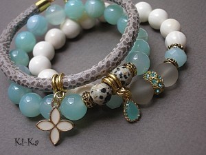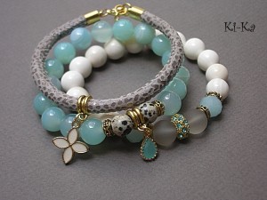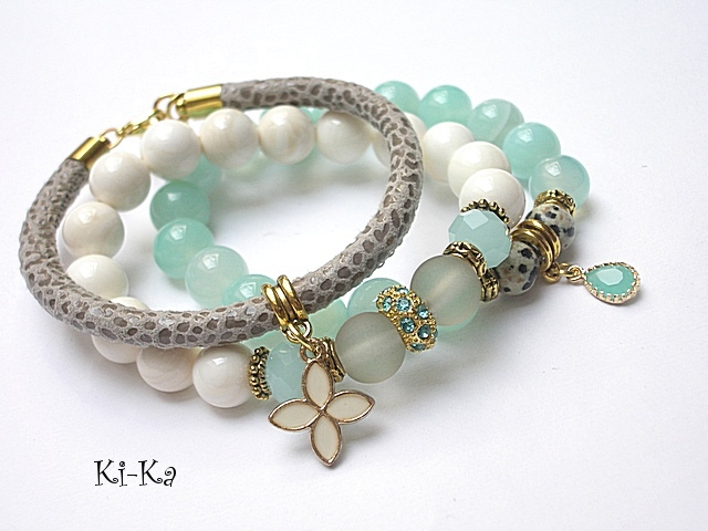 Komplet trzech bransoletek wykonany z kamieni naturalnych - agat [10mm], muszla [10mm], jaspisy [8mm], kryształków [10mm], szklanej zawieszki w okuciu z mosiądzu platerowanego 24k złotem, szklanych matowych kuleczek [10mm], skórzanego rzemienia z naturalnej skórki [6mm] oraz elementów w kolorze złota. Pasują na nadgarstek 15 -16,5cm. Bransoletki z kamienie na gumce silikonowej. Biżuteria ozdobnie zapakowana