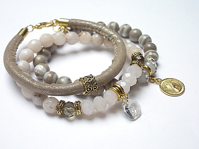 PROJEKT AUTORSKI. Komplet trzech bransoletek wykonanych z naturalnych kamieni - jadeity [8mm -kamienie posiadają liczne inkluzje] ,krzemień pasiasty [8mm] ,agaty wysadzane cyrkoniami [8mm] ,kryształki [8mm] ,kryształek Swarovskiego [12mm silver shade] , rzemienia ze skórki ekologicznej oraz elementów metalowych w kolorze tzw.różowego złota.Bransoletki pasują na nadgarstek 15,5-16,5cm. Biżuteria ozdobnie zapakowana