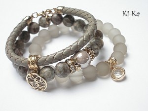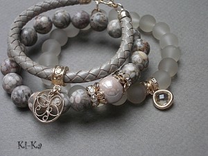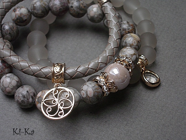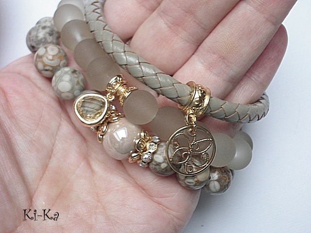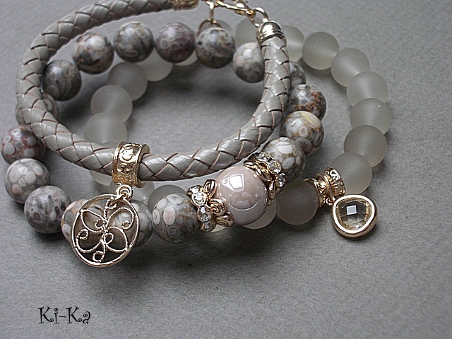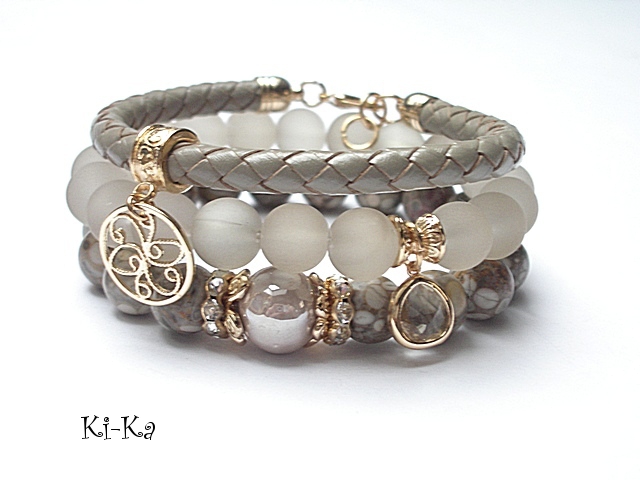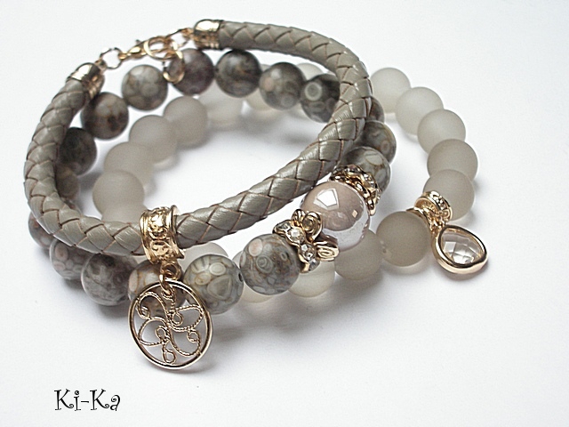 PROJEKT AUTORSKI. Własność KI-Ka. WSZELKIE INNE PODOBNE MODELE TO KOPIE NARUSZAJĄCE PRAWA AUTORSKIE. Komplet trzech bransoletek wykonany z kamieni naturalnych - jaspisy [10mm], matowe szklane kuleczki [10mm], ceramiczna kula [12mm], rzemienia z naturalnej skóry [śr. 6mm] ,zawieszki w okuciu z mosiądzu platerowanej złotem, skórzanego rzemienia [6mm] oraz elementów w kolorze tzw. różowego złota. Pasują na nadgarstek 16-17cm. Bransoletki na gumce silikonowej. Biżuteria ozdobnie zapakowana.
