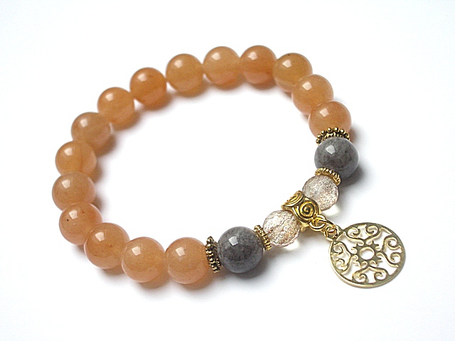 PROJEKT AUTORSKI. KOPIOWANIE ZABRONIONE.WŁASNOŚĆ KI-KA. Bransoletka wykonana z kamieni naturalnych - jadeity [10mm], kwarcu fasetowanego ze złotymi drobinkami [10mm], kuleczek awenturynów [10mm], zawieszki z mosiądzu pozłacanego złotem oraz elementów metalowych w kolorze złota. Bransoletka na gumce silikonowej. Pasuje na nadgarstek 16-17cm. Biżuteria ozdobnie zapakowana. Możliwość dopasowania bransoletki do nadgarstka - wcześniej prosimy o kontakt