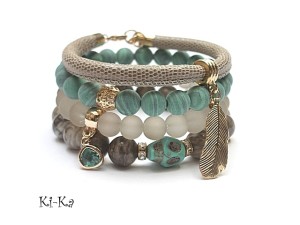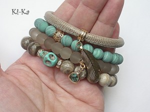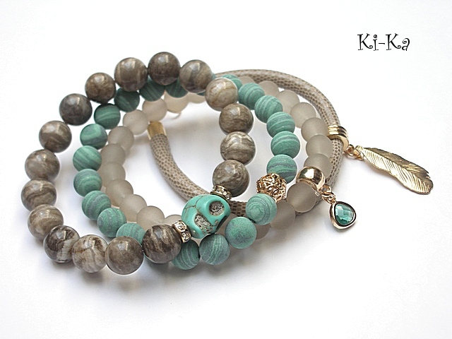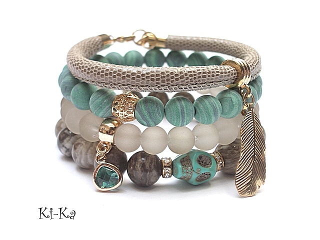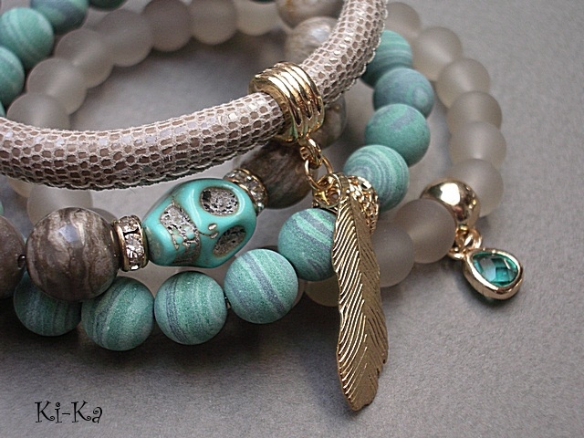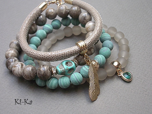 PROJEKT AUTORSKI. WŁASNOŚĆ KI-KA. KOPIOWANIE ZABRONIONE Komplet czterech bransoletek wykonanych z naturalnych kamieni: jaspis [10mm], matowych turkusów rekonstruowanych [10mm], szklanych matowych kuleczek [10mm], czaszki z howlitu, efektownej zawieszki ze szkła, rzemienia z naturalnej, miękkiej skórki o wężowym wzorze [śr. 6mm] oraz elementów metalowych w kolorze tzw. różowego złota. Bransoletki z kamieni i szkła na gumce silikonowej. Pasują na nadgarstek16-17cm. W przypadku zmiany rozmiaru bransoletek prosimy o wcześniejszy kontakt. Biżuteria ozdobnie zapakowana.