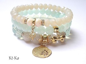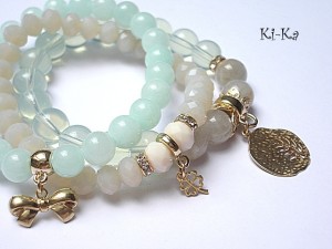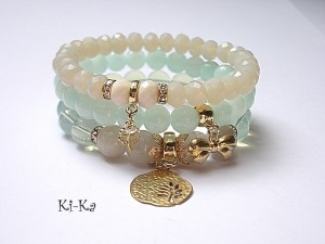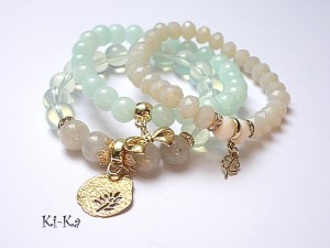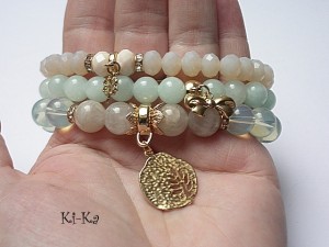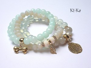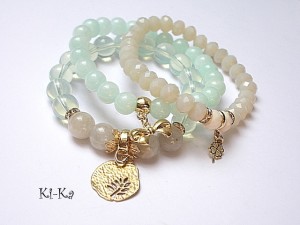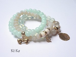 PROJEKT AUTORSKI . Komplet trzech bransoletek wykonany z naturalnych kamieni - jadeity [8 i 10mm], kryształki [8 x 6mm], szkła [10mm] oraz elementów w kolorze tzw.różowego złota. Bransoletki pasują na nadgarstek 16-17cm. Biżuteria ozdobnie zapakowana.