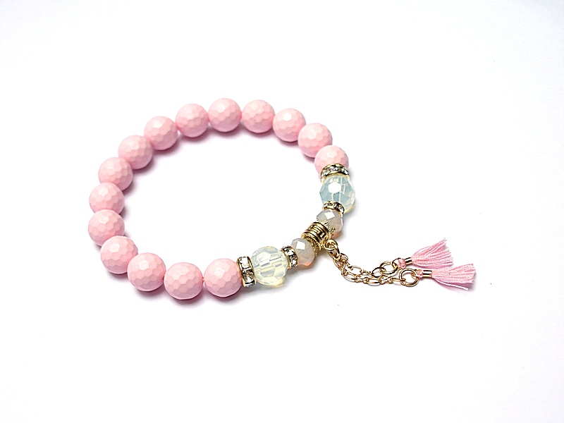 Bransoletka wykonana z fasetowanej muszli [10mm], fasetowanego opalitu [10mm], kryształków [8mm], chwostów oraz elementów metalowych w kolorze złotym. Bransoletka na gumce silikonowej. Pasuje na nadgarstek 16-17cm. Biżuteria ozdobnie zapakowana.