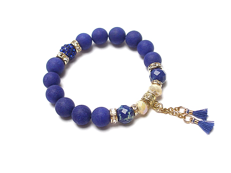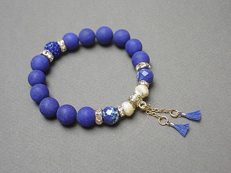 Bransoletka wykonana z naturalnych kamieni - jadeity matowe [10mm], jaspis fasetowany [10mm], kryształki [8mm], przekładki shamballa wysadzanej kryształkami Swarovski [10mm], chwostów oraz elementów metalowych w kolorze złotym. Bransoletka na gumce silikonowej. Pasuje na nadgarstek 15-16cm. Biżuteria ozdobnie zapakowana.