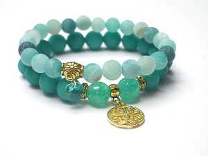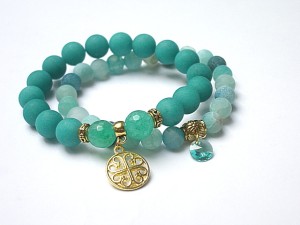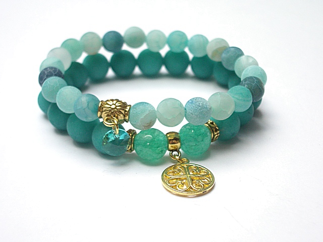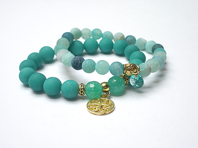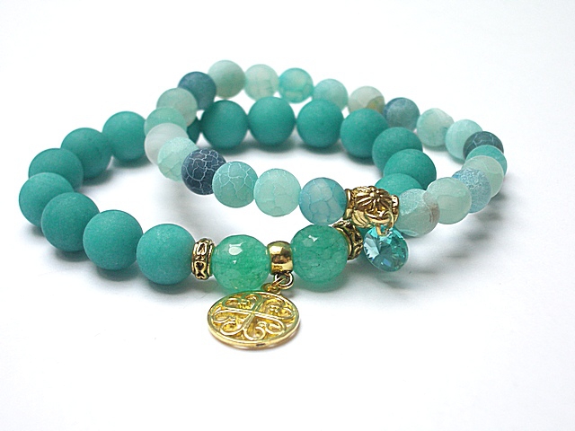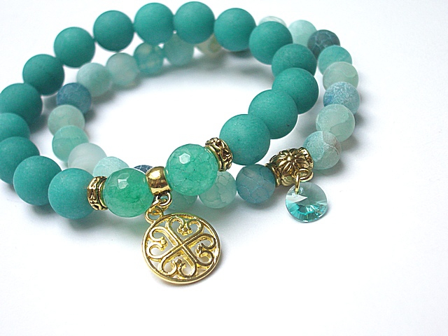 PROJEKT AUTORSKI. Komplet dwóch bransoletek wykonanych z naturalnych kamieni - kuleczki matowych jadeitów [10mm],fasetowane jadeity [10mm] ,agaty trawione [8mm] ,kryształek Swarovskiego [8mm] oraz elementów metalowych w kolorze żółtego złota.