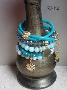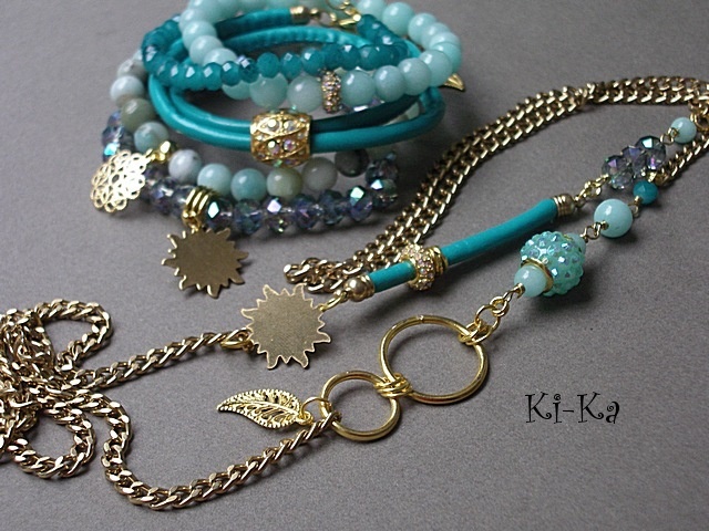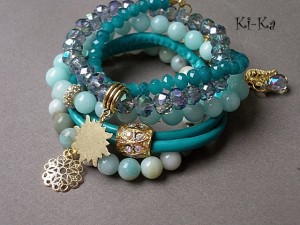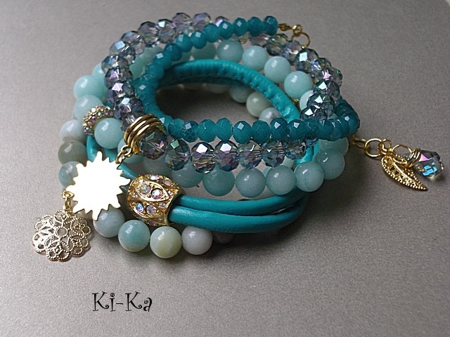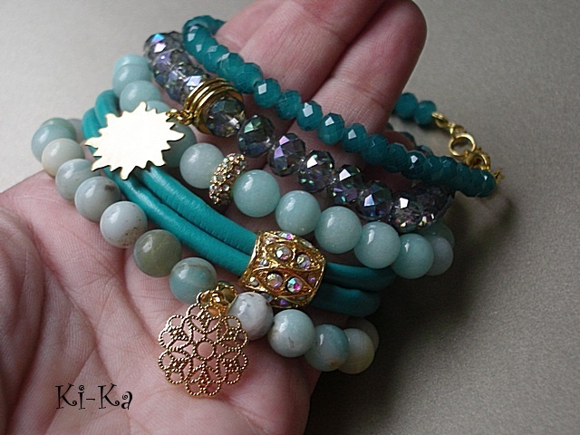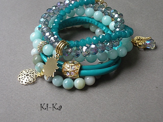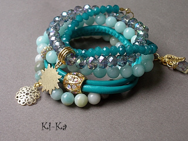 Komplet pięciu bransoletek wykonanych z naturalnych minerałów: jadeitów [8mm], amazonitów [8mm], fasetowanych szklanych kryształków rzemienia ze skórki ekologicznej oraz elementów metalowych w złotym kolorze [przywieszki z mosiądzu]. Bransoletki pasują na nadgarstek 15,5 - 16,5cm. Biżuteria ozdobnie zapakowana. Do kompletu można dokupić długi naszyjnik dostępny w naszej galerii - zdjęcia