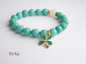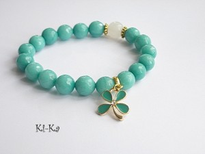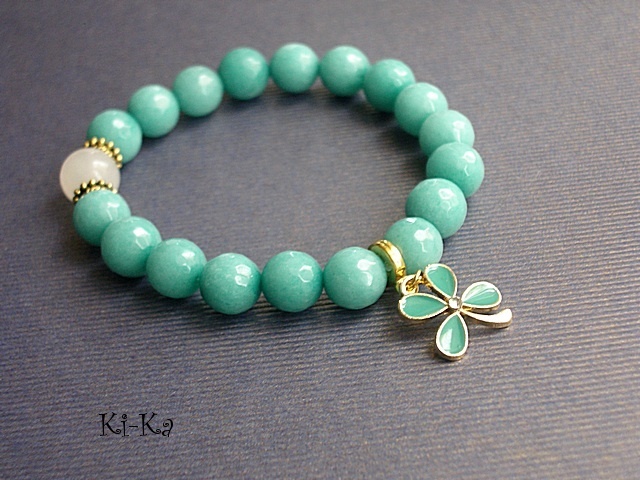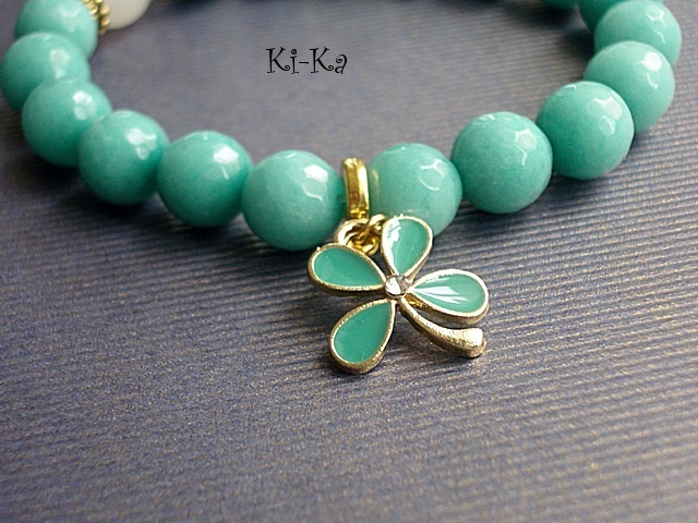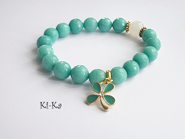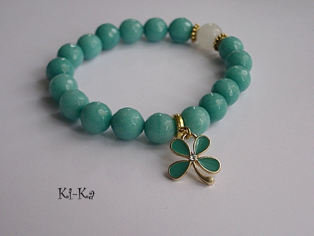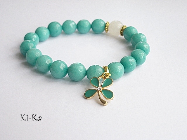 Bransoletka wykonana z naturalnych, kamieni - fasetowane jadeity, agat [10mm] oraz elementów w kolorze złota [przekładka z kryształkiem]. Bransoletka na gumce silikonowej. Pasuje na nadgarstek 15-16,5cm. Biżuteria ozdobnie zapakowana. Możliwość dopasowania bransoletki do nadgarstka - wcześniej prosimy o kontakt.