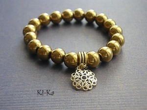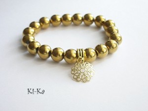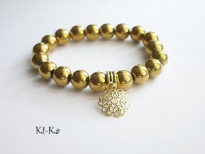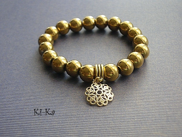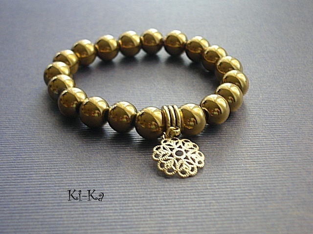 Bransoletka wykonana z naturalnych, kamieni - hematyt [10mm] oraz elementów w kolorze złota Bransoletka na gumce silikonowej. Pasuje na nadgarstek 15-16,5cm. Biżuteria ozdobnie zapakowana. Bransoletka może stanowić komplet z innymi modelami - przykładowe zdjęcia.