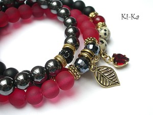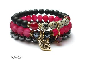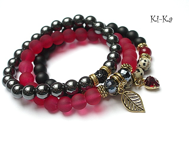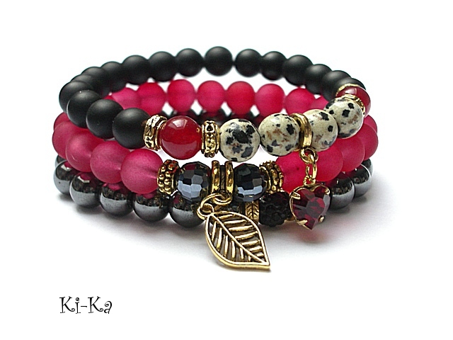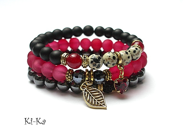 PROJEKT AUTORSKI. Komplet trzech bransoletek wykonanych z naturalnych kamieni - matowe kuleczki black stone [8mm] ,hematyty [8mm] ,szklane matowe kuleczki [8mm],jaspisy [8mm] ,jadeity [8mm] kuleczki shamballa wysadzanej kryształkami Swarovskiego ,kryształkami [8mm] ,zawieszki-serca z metalu pokrytego srebrem [pr.925] pozłoconego 18k złotem i wysadzanego kryształkiem Swarovskiego oraz elementów metalowych w kolorze złota.Bransoletki pasują na nadgarstek 15-16,5cm. Biżuteria ozdobnie zapakowana